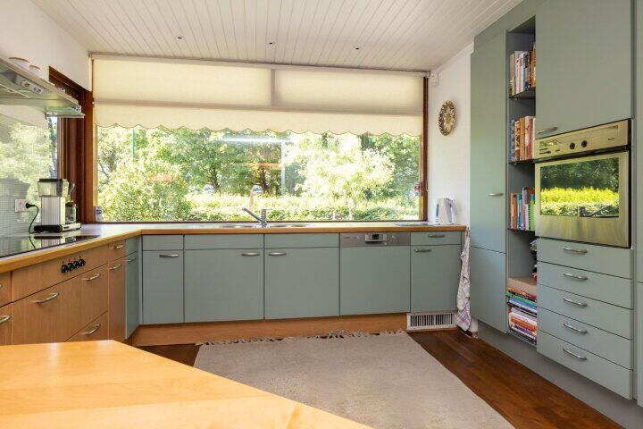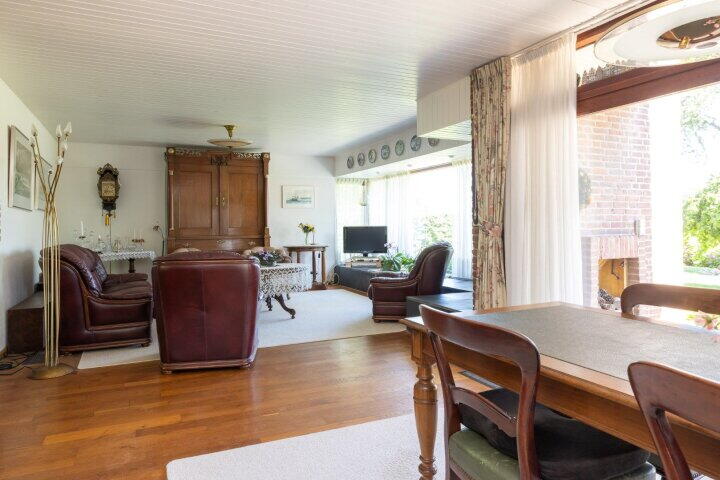 And not least, the fantastic garden surrounding the house, located next to private fishing water with a wooden pier, extra storage, the insulated outdoor terrace with an outdoor fireplace, and the insulated driveway for multiple cars. The insulation ensures that both the terrace and the driveway remain ice-free in winter.